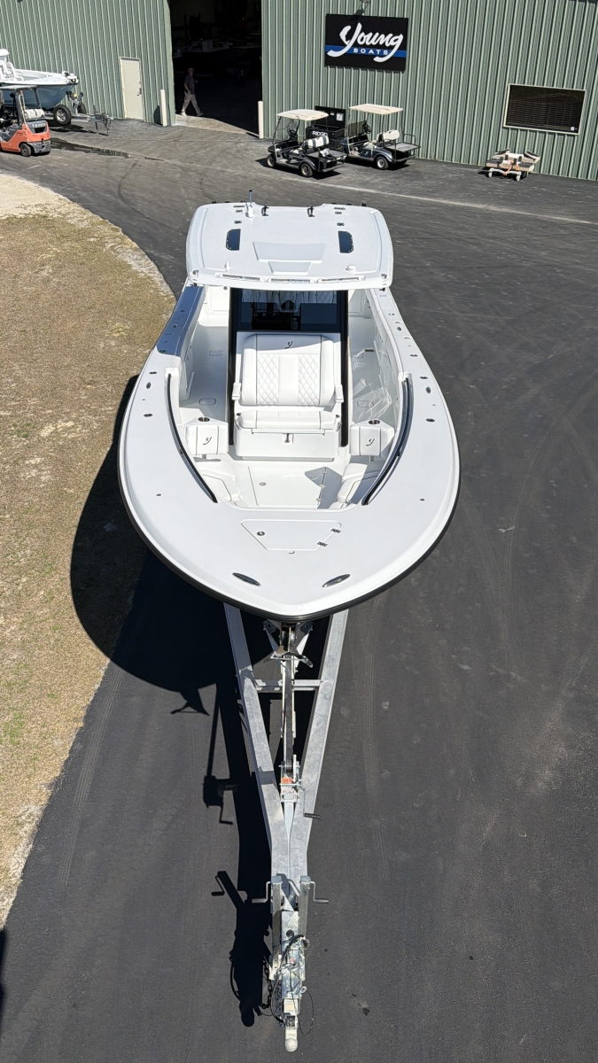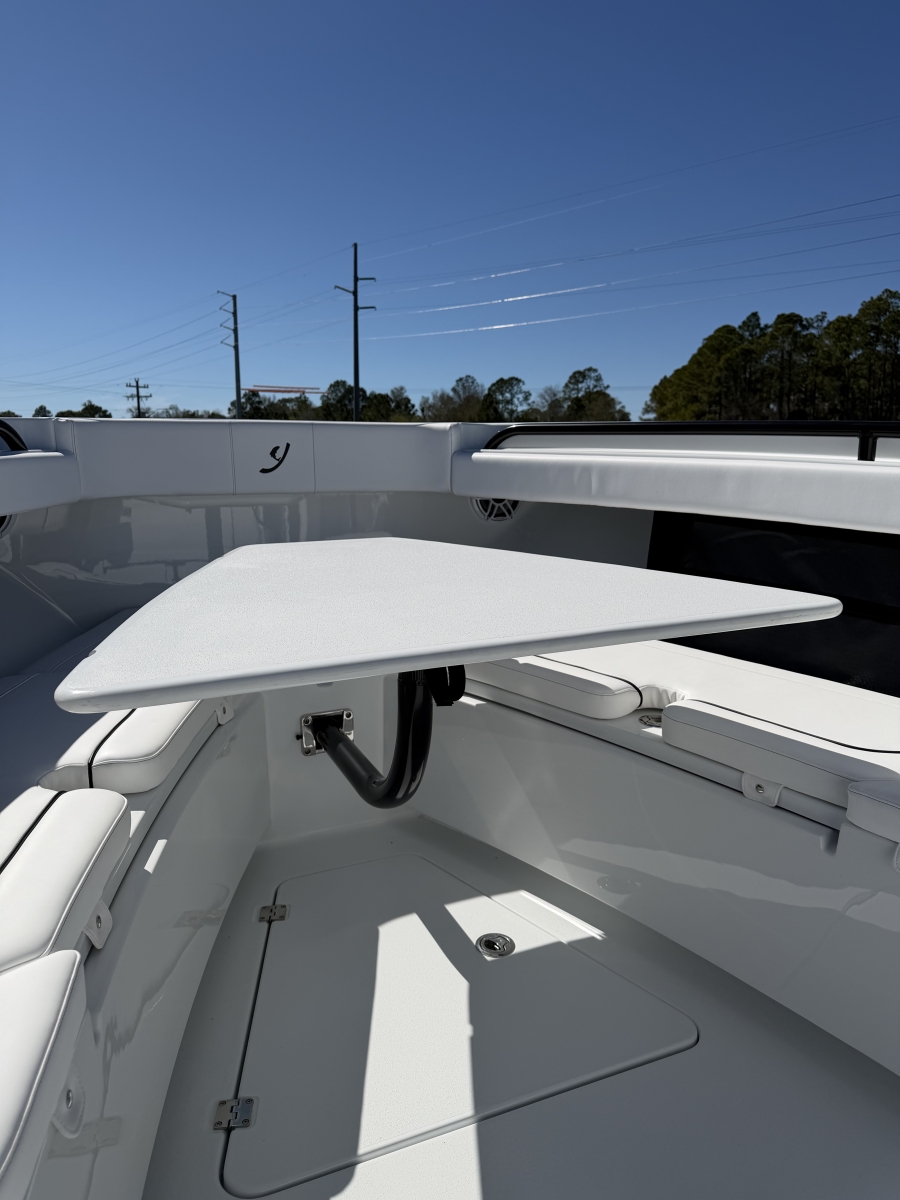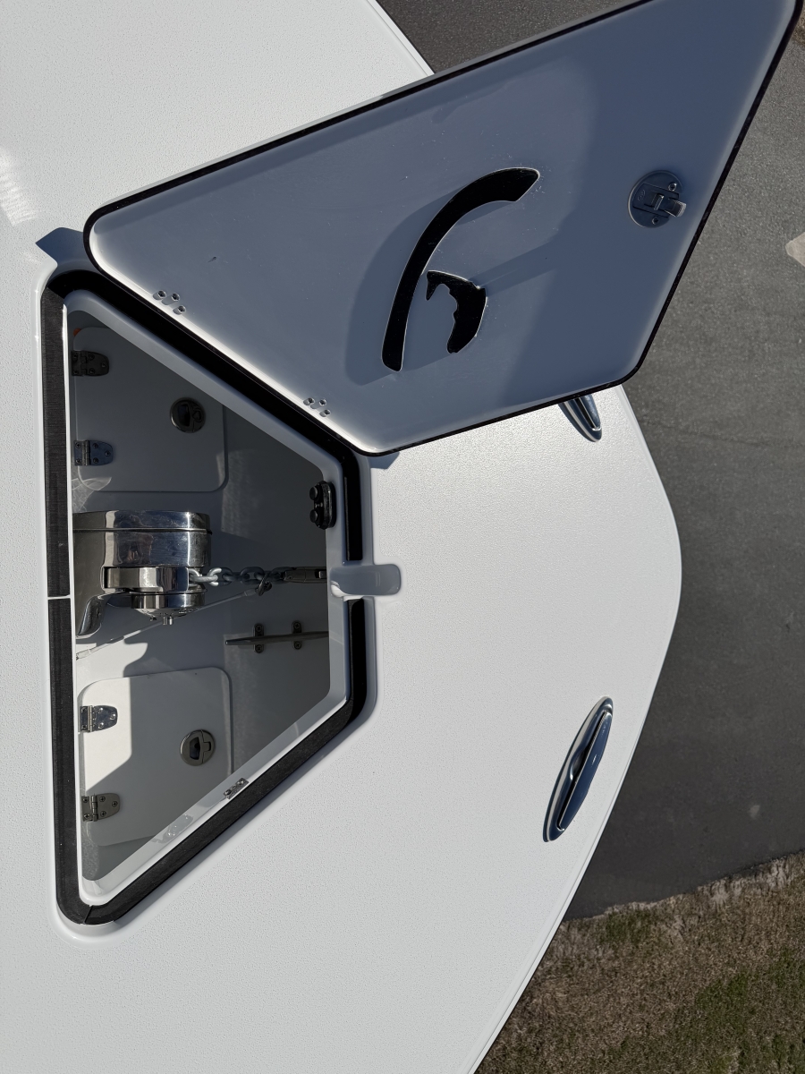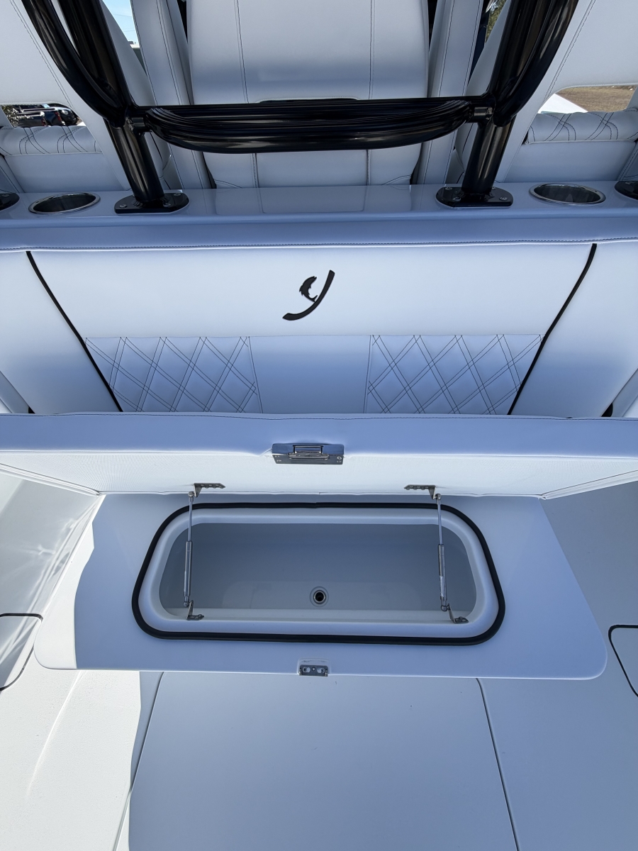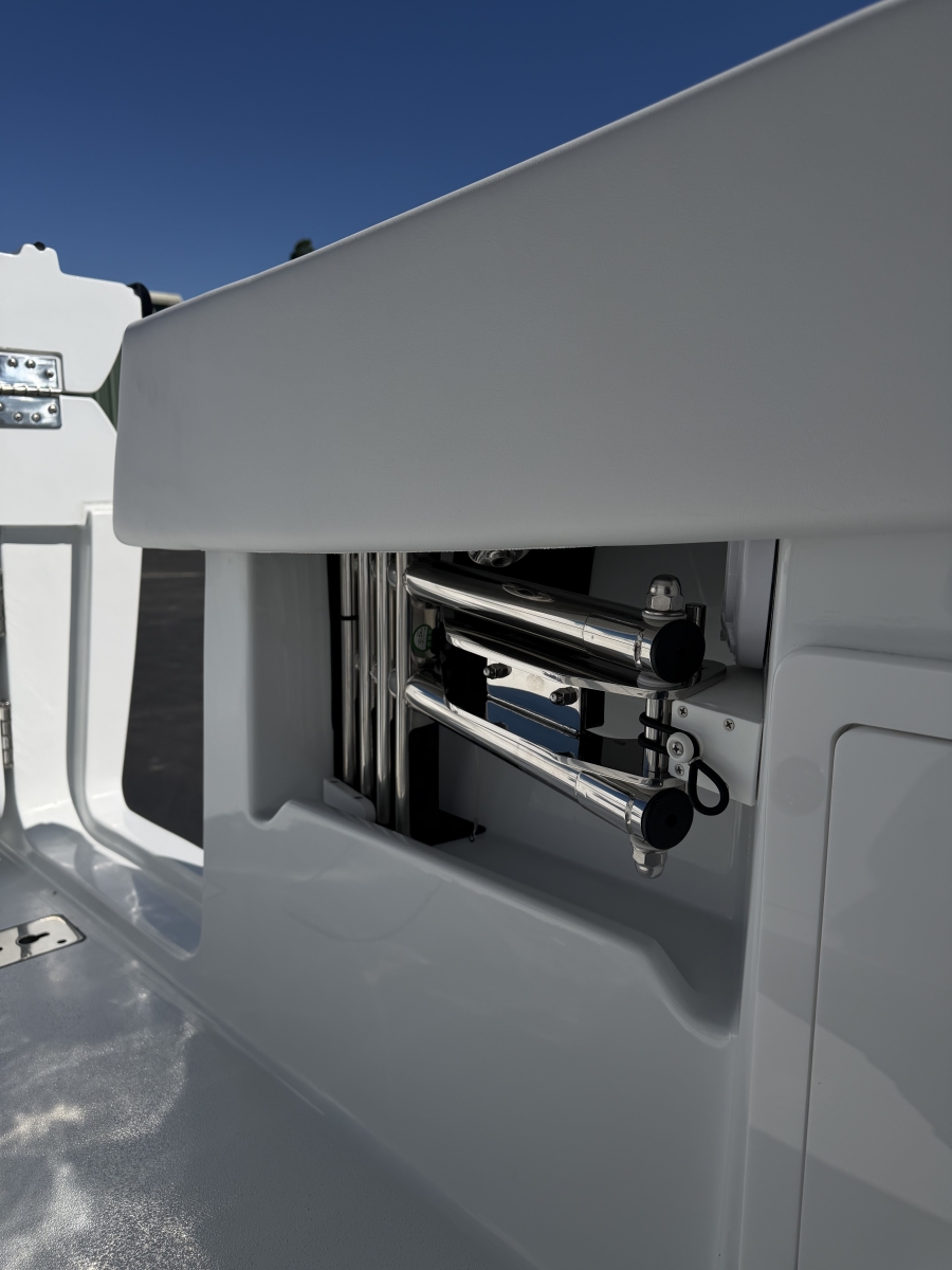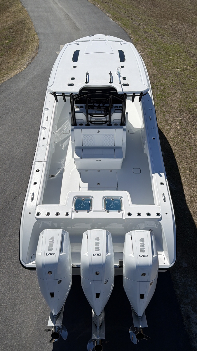 Triple-engine capable, all-composite cored hull engineered for strength, efficiency, and a smooth, dry ride. Three-piece, self-bailing construction with large fuel capacity for long-range trips.